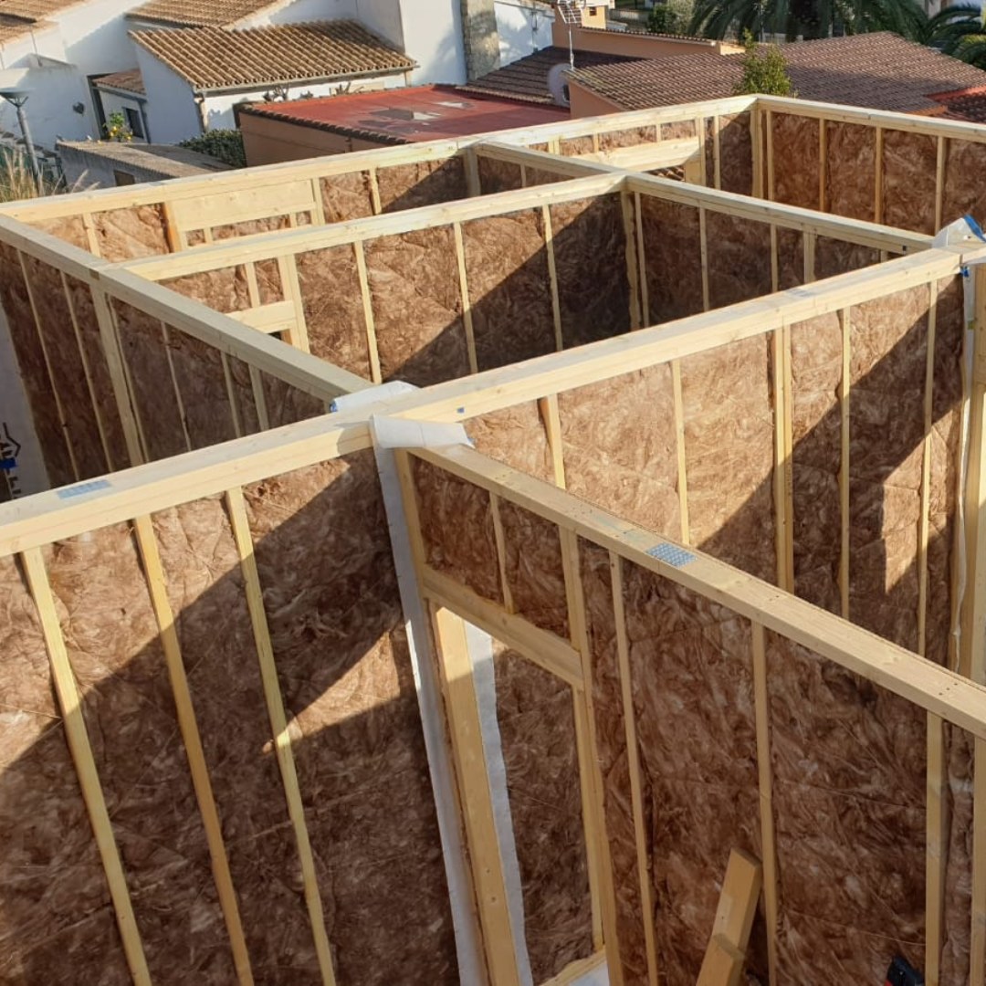 The interior walls have a framing structure measuring 100x45mm, glass mineral wool – sound absorbent, and 12mm OSB sheets.