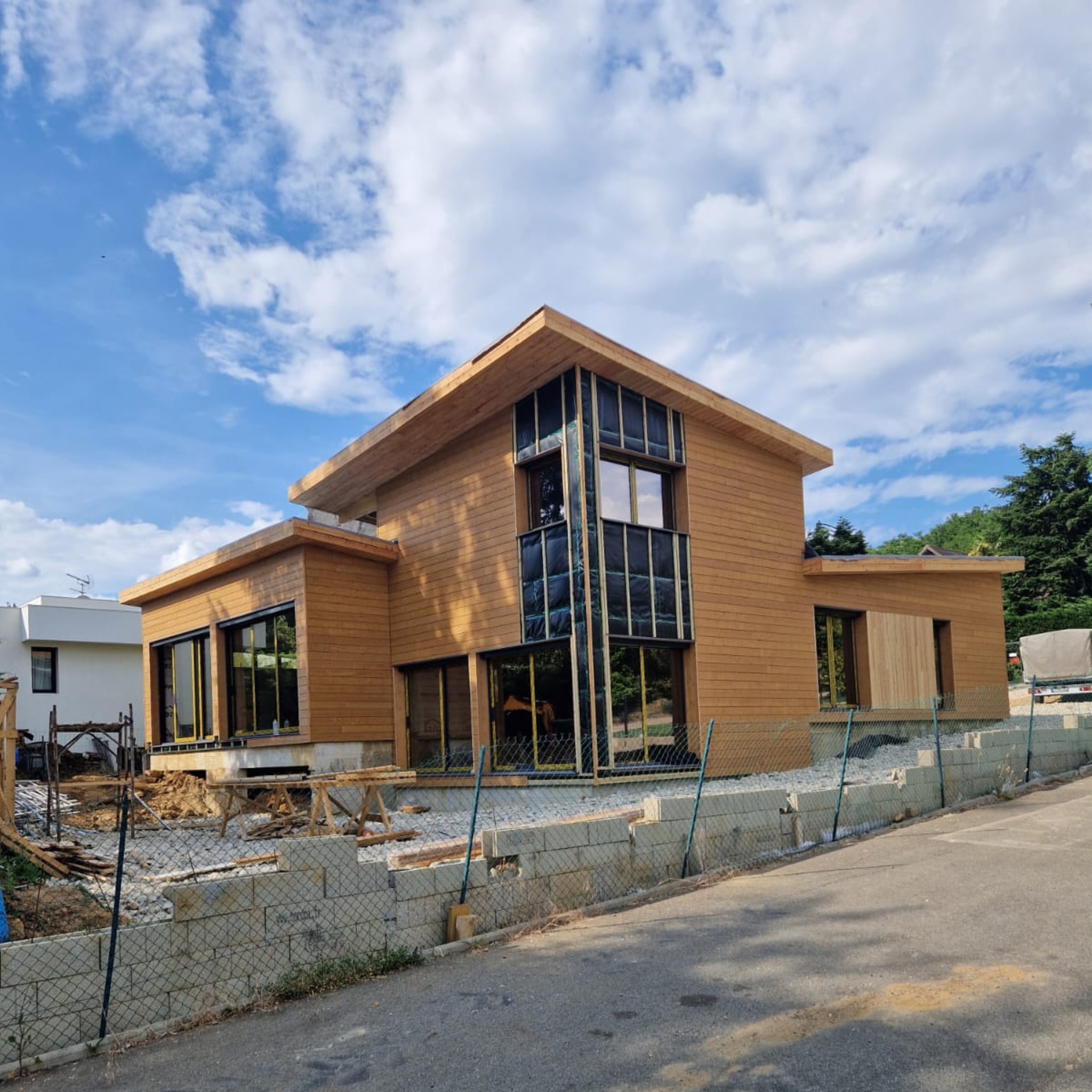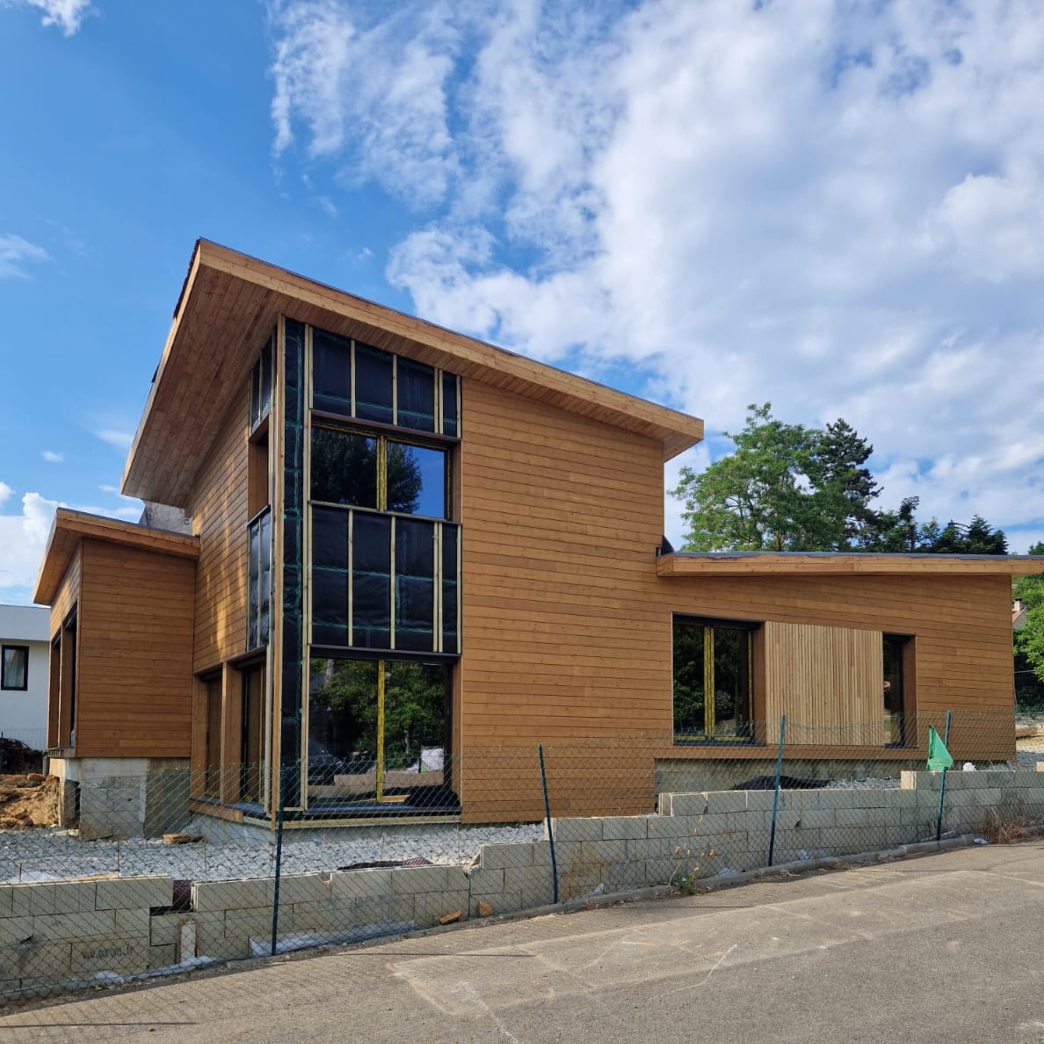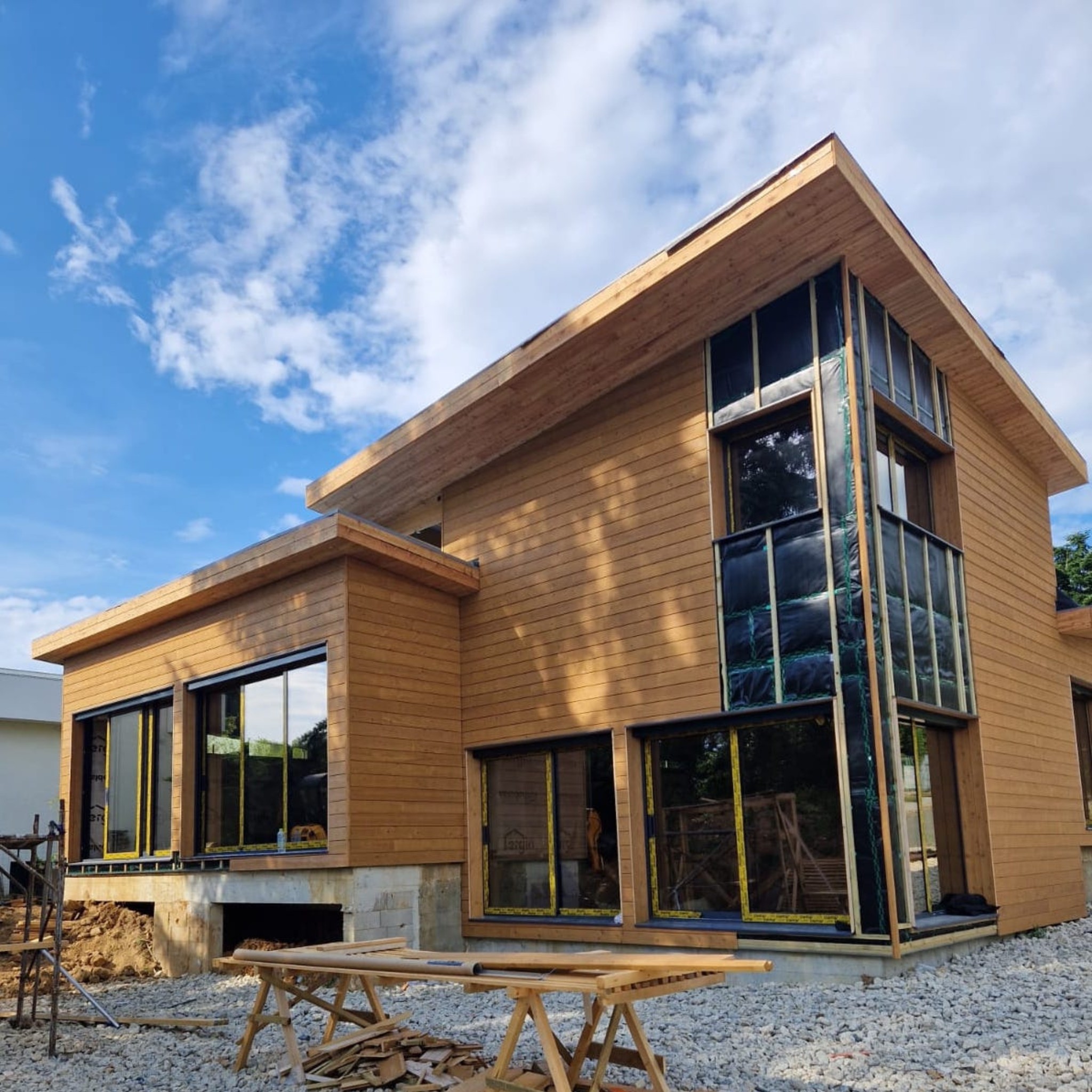 The building is quite impressive, covering an area of 210 square meters. It incorporates 40 cubic meters of wood and is designed to feature large open spaces.