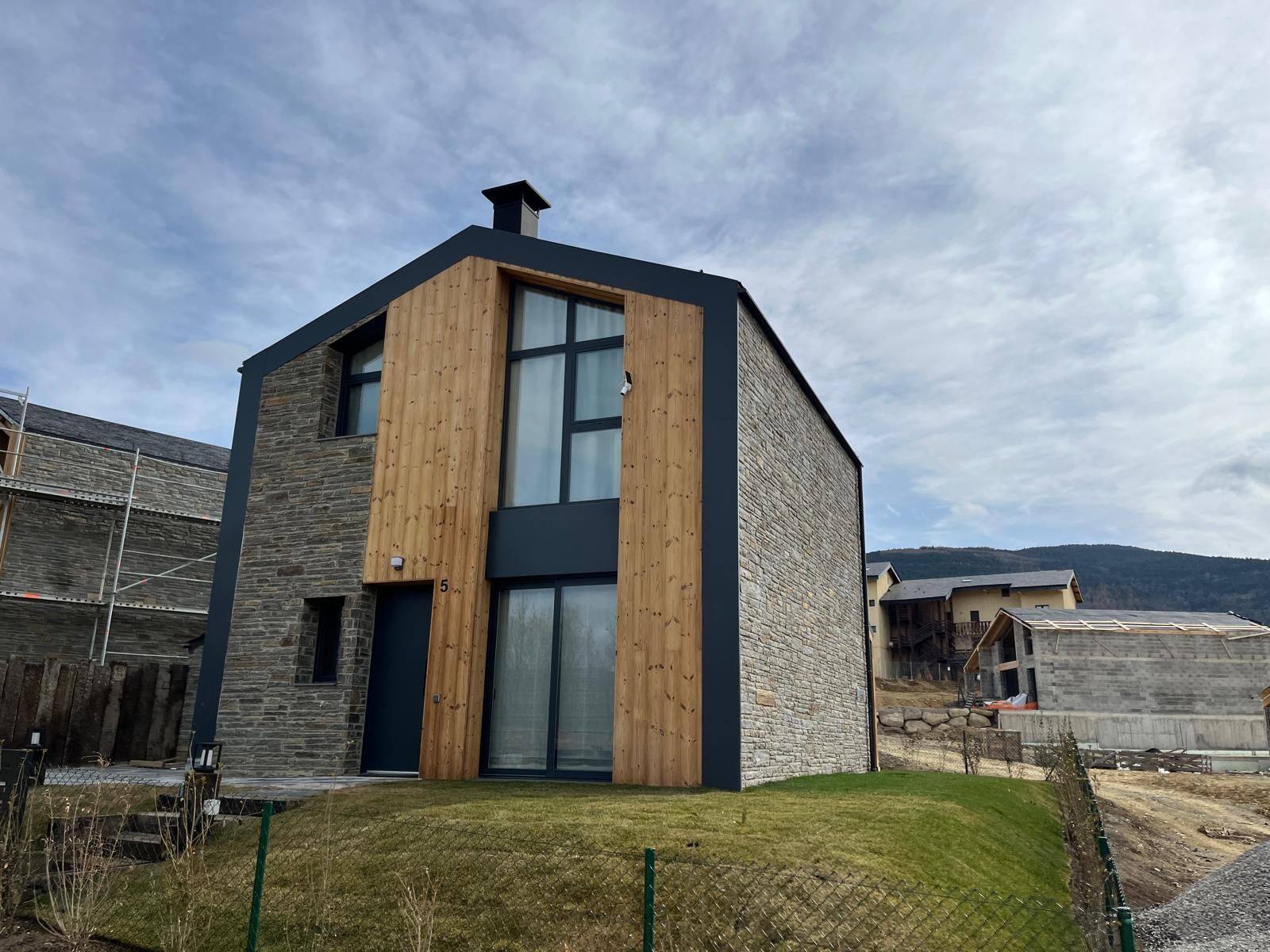Finishes: a balanced mix of fribrociment, natural stone, and timber cladding gives the home its distinctive character.
